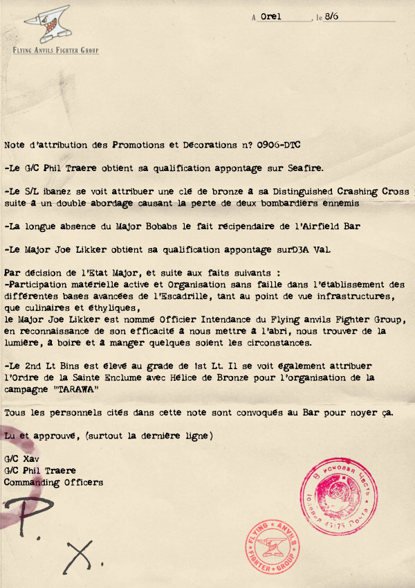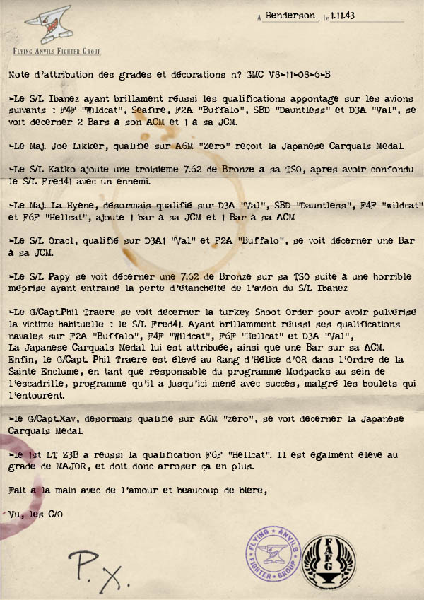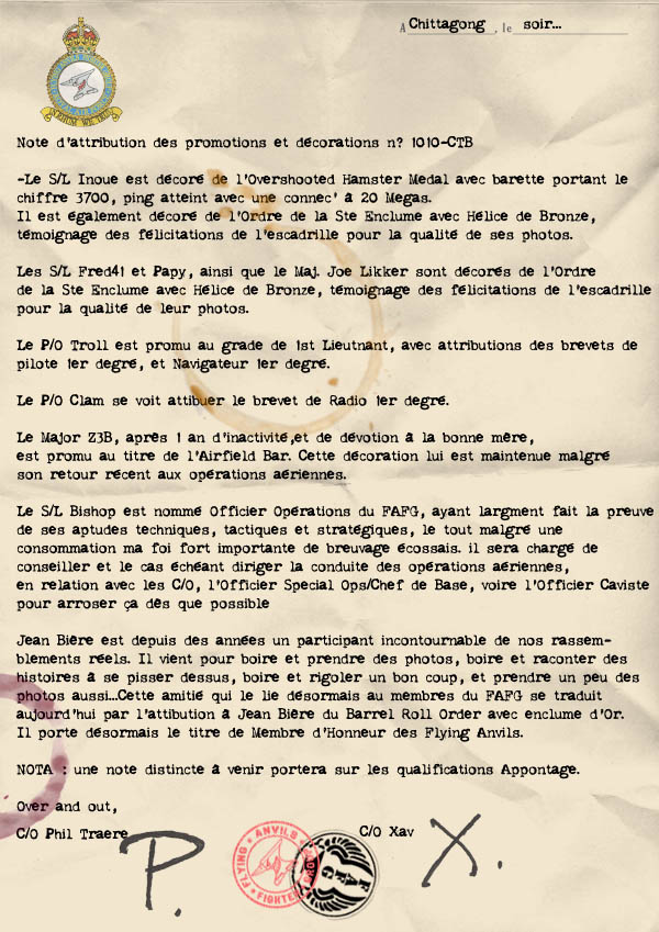 | L'histoire avec un gros Q 28/07/2009 à 19:02 L'histoire des Flying Anvils est désormais disponible en page propagande en cliquant sur le livre "FAFG At War". De nouveaux épisodes seront bientôt et régulièrement mis en ligne (ça pue la promesse d'ivrogne ça....) Xav |